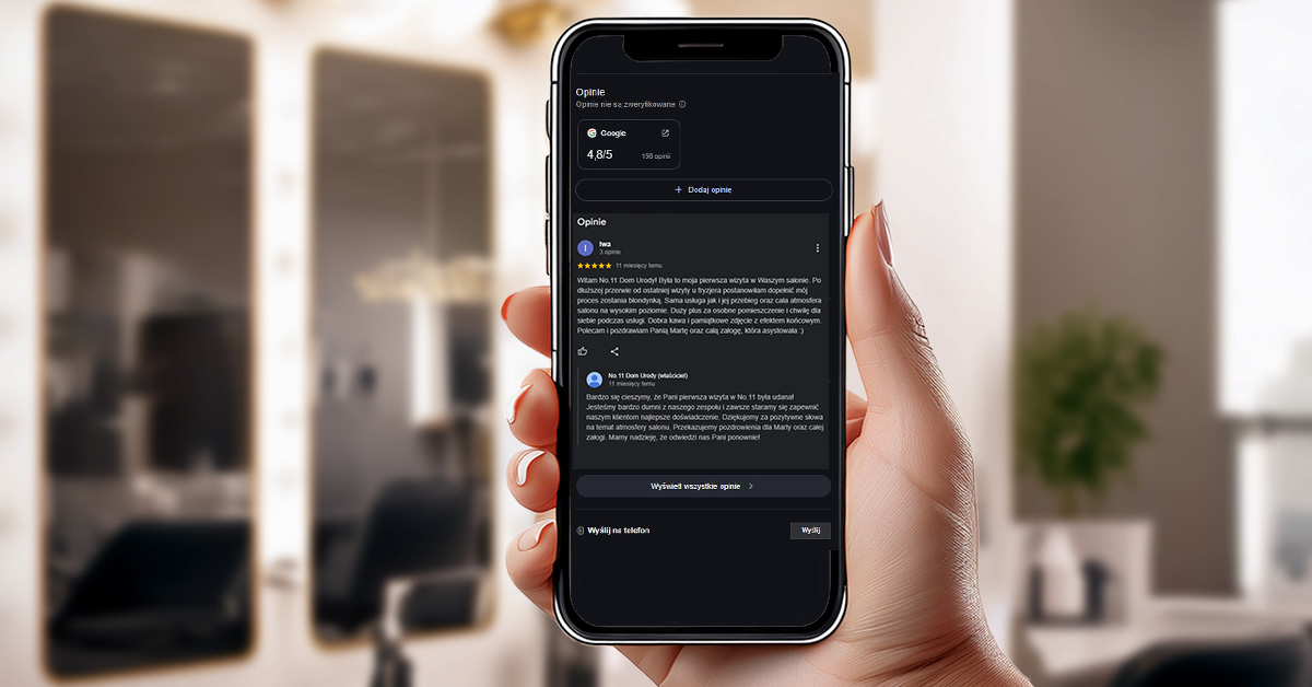 To właśnie dzięki tej wizytówce Twój salon pojawia się na mapie Google oraz wysoko w wynikach wyszukiwania, kiedy ktoś wpisze np. „fryzjer w [Twoje miasto]”.